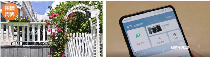 部署全彩智能警戒监控摄像头,当有可疑人员攀爬围墙周界时,语音提醒“警戒区域,尽快离开”,并将可视化报警消息推送给别墅业主,便于业主采取相应保障措施。